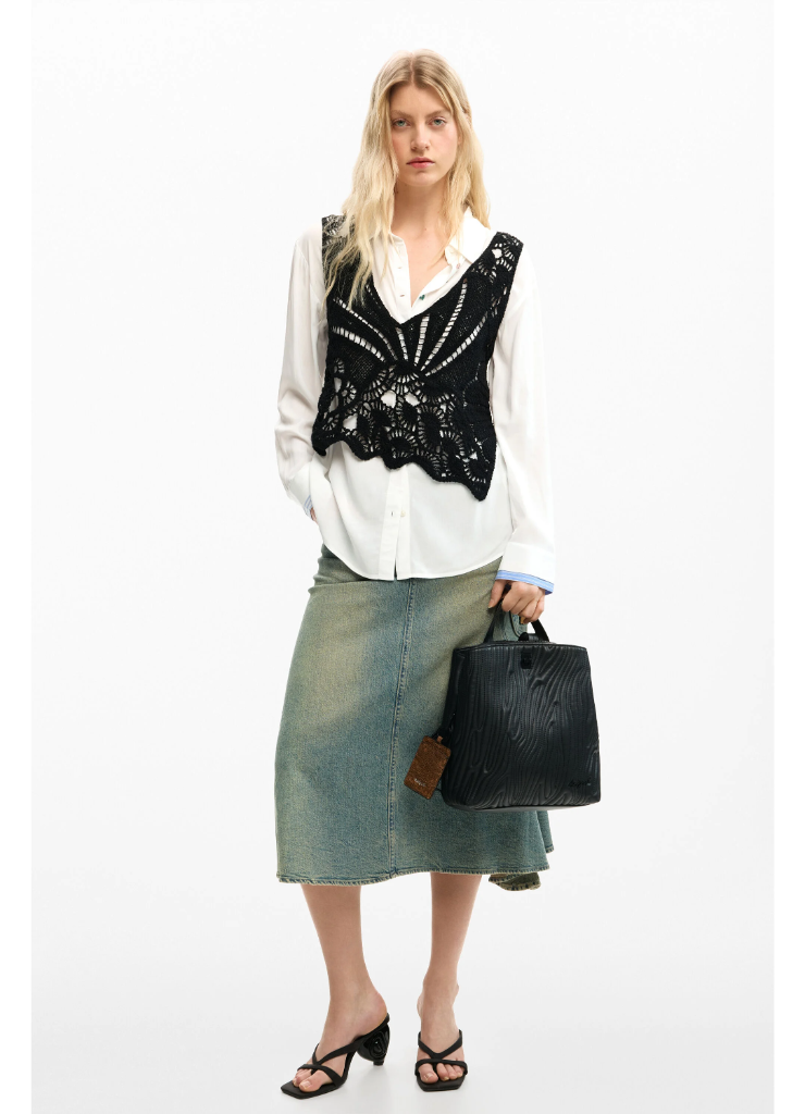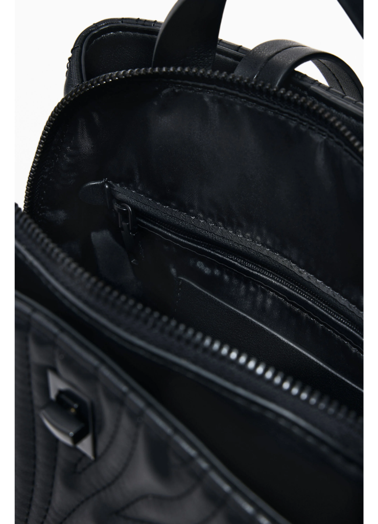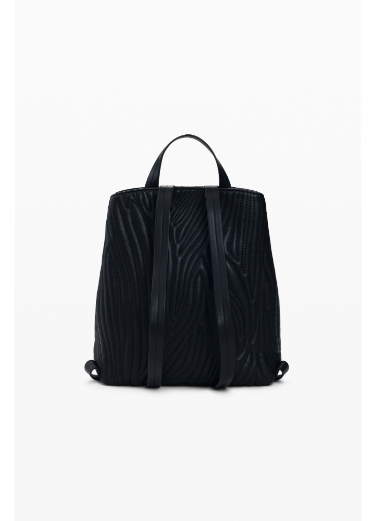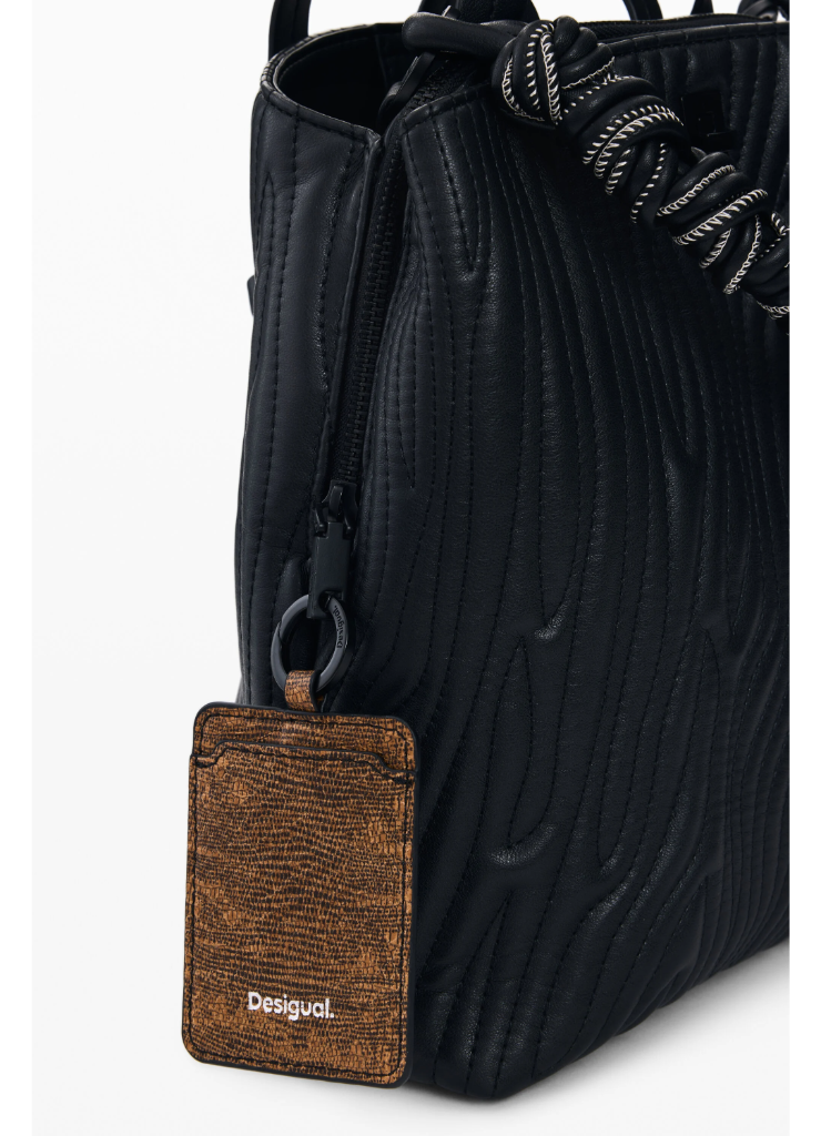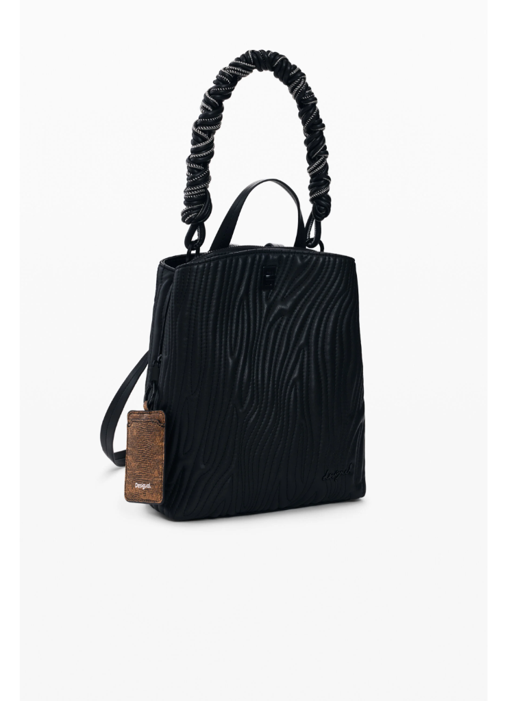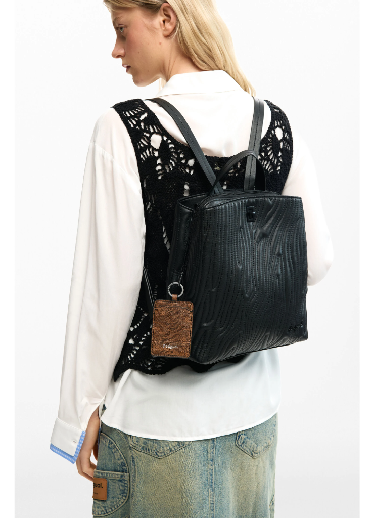 Μικρό σακίδιο πλάτης κατασκευασμένο από ύφασμα με υφή, με πλεκτή χειρολαβή και λεπτομέρεια γούρι με θήκη για κάρτες.