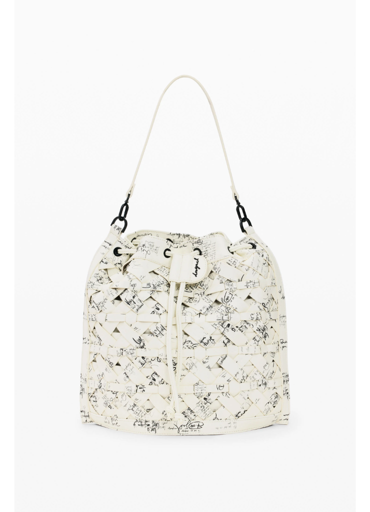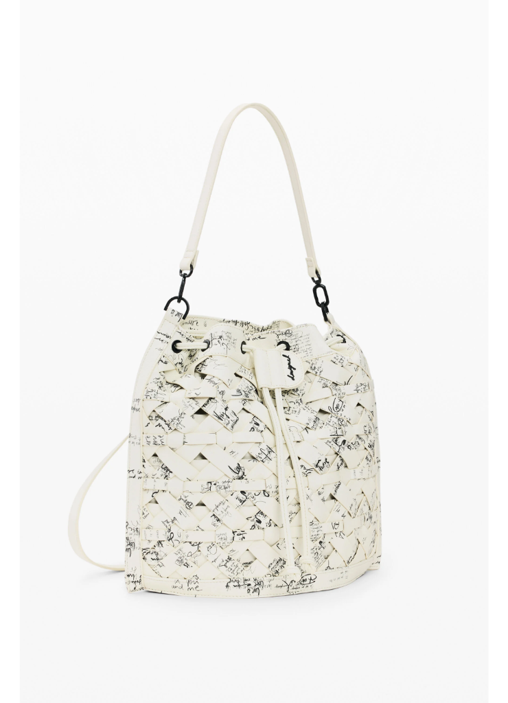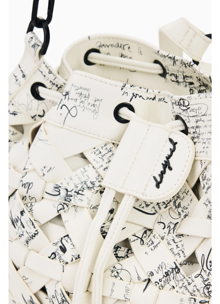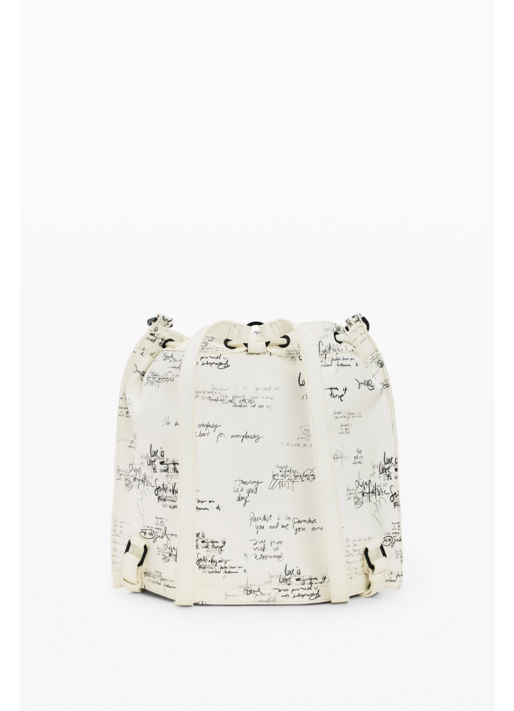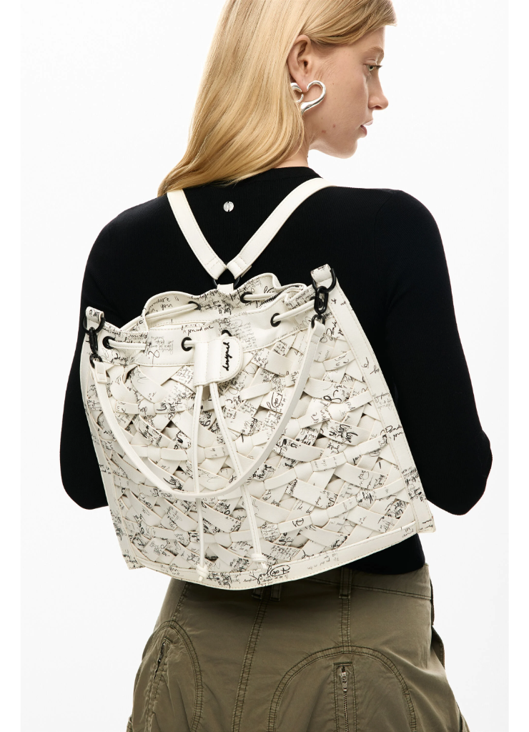 Μεσαίο σακίδιο πλάτης που μετατρέπεται σε τσάντα, με πλεκτές λεπτομέρειες, γούρι με καρτοθήκη, εναλλάξιμους ιμάντες και στάμπα σε στυλ lettering.