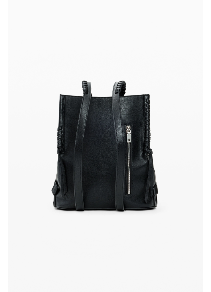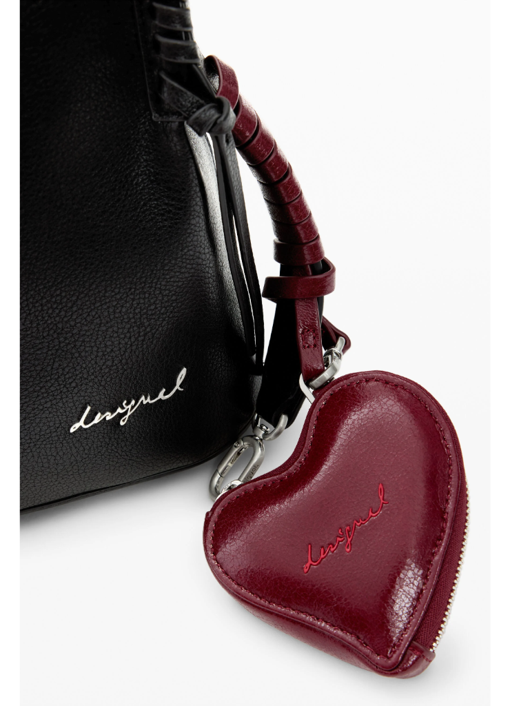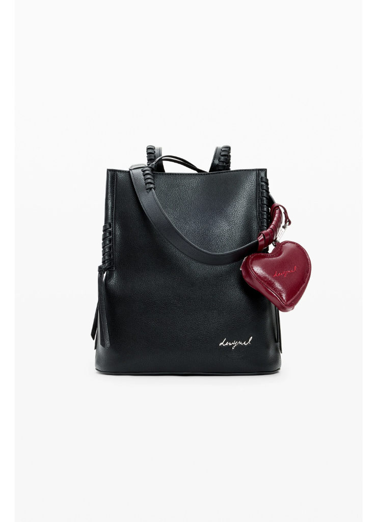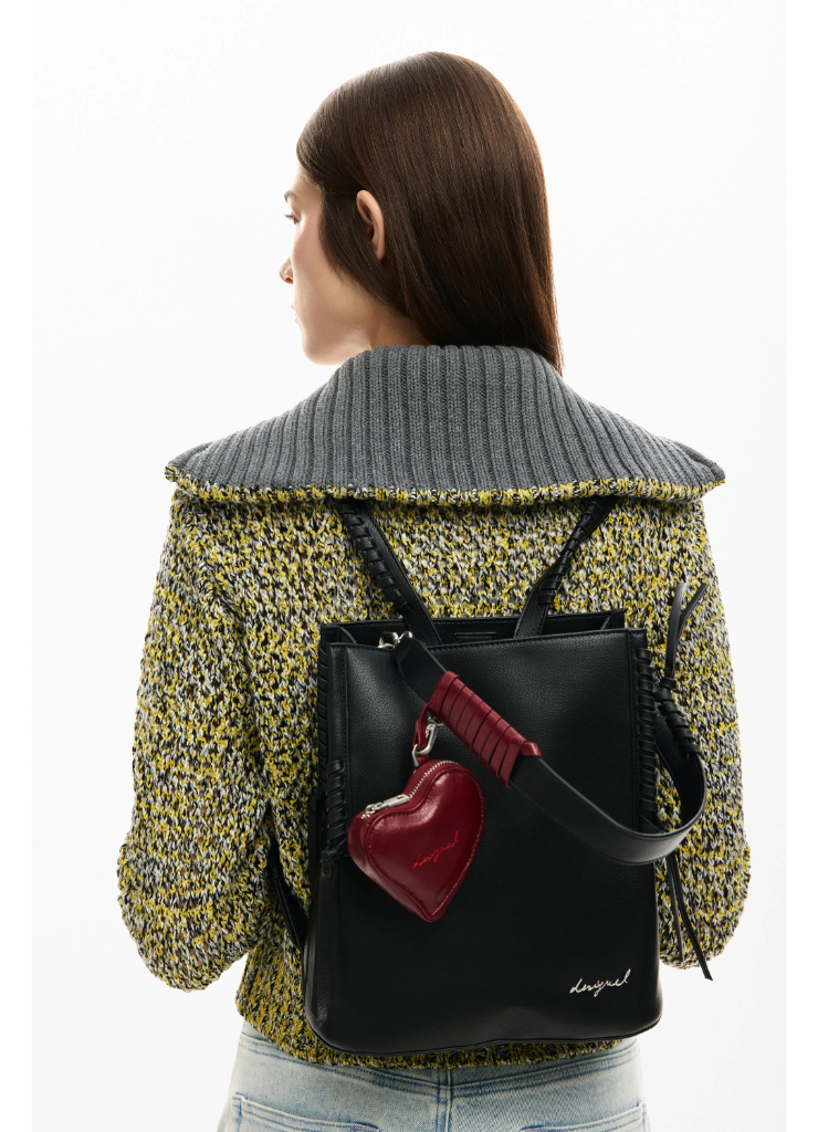 Μεσαίο σακίδιο πλάτης με αφαιρούμενο λουράκι, γούρι μίνι-πορτοφολιού σε σχήμα καρδιάς που αφαιρείται και πλεχτές λεπτομέρειες.