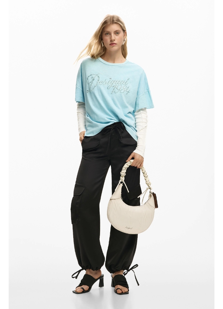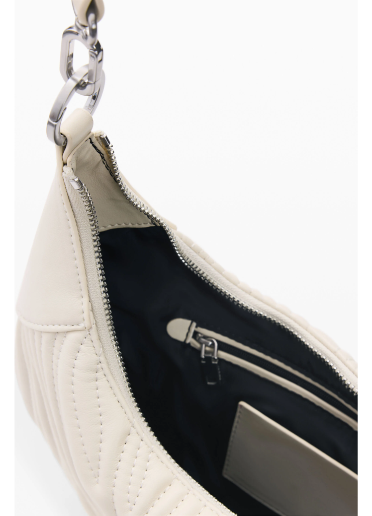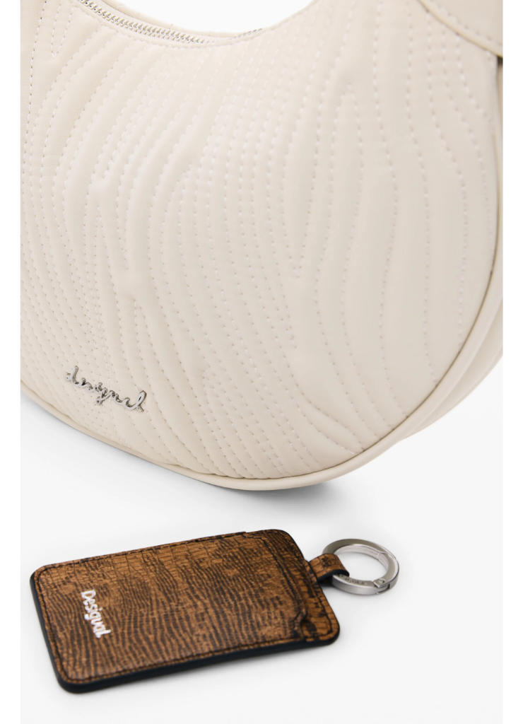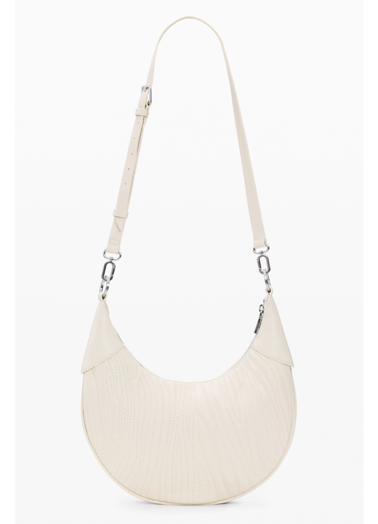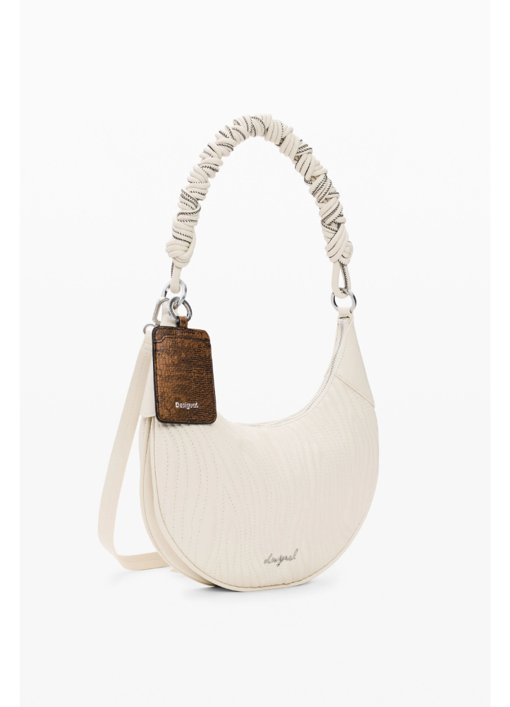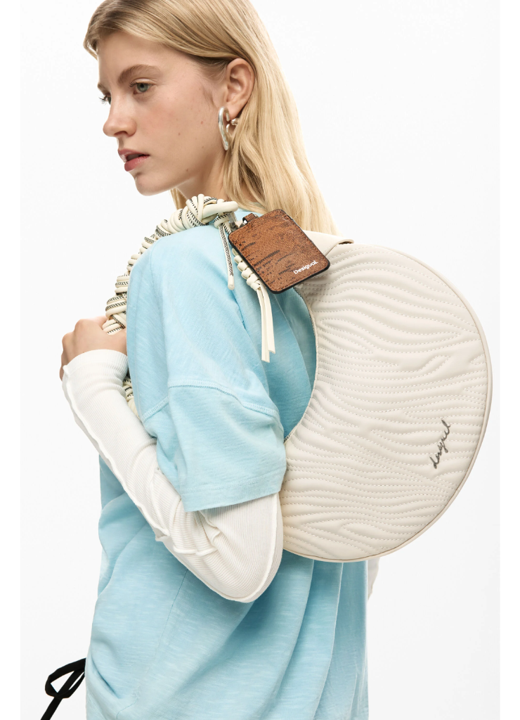 Μεσαία τσάντα οβάλ σχήματος με εναλλάξιμους ιμάντες, έναν κοντό και έναν πιο μακρύ τύπου χιαστί, με κεντητές ραφές στο ίδιο χρώμα και μεταλλική λεπτομέρεια με λογότυπο.