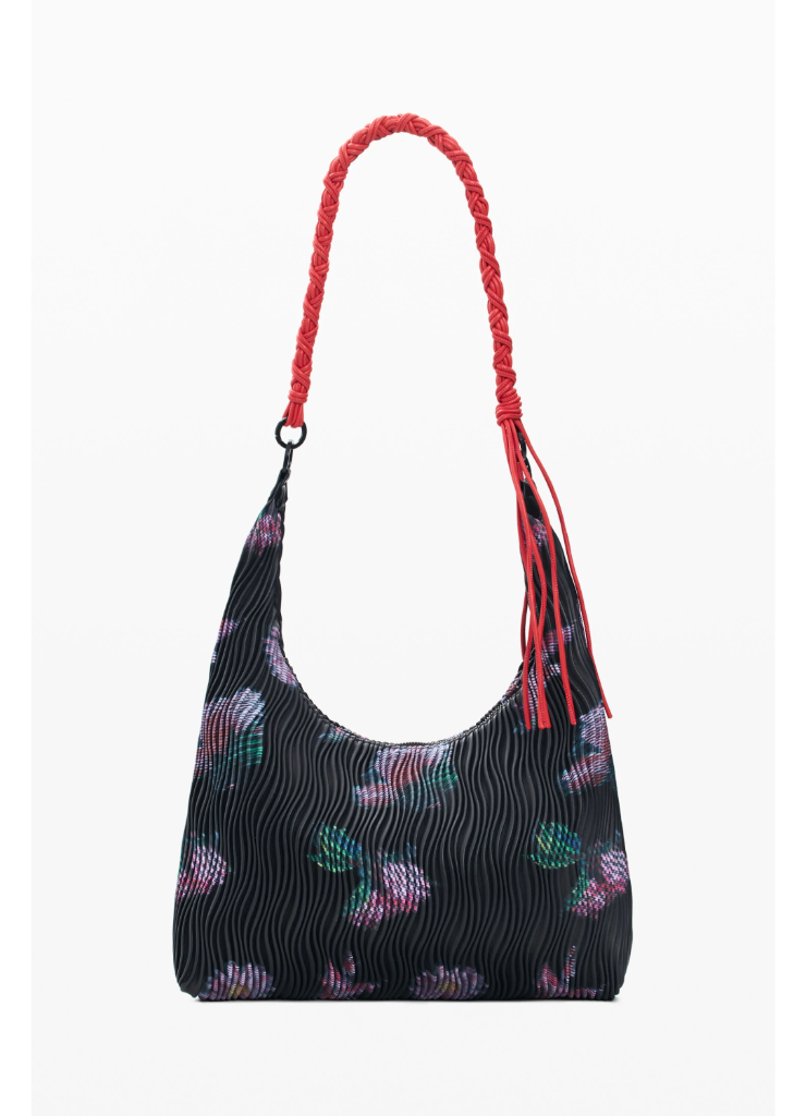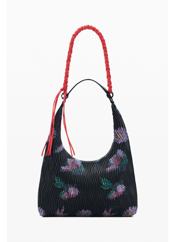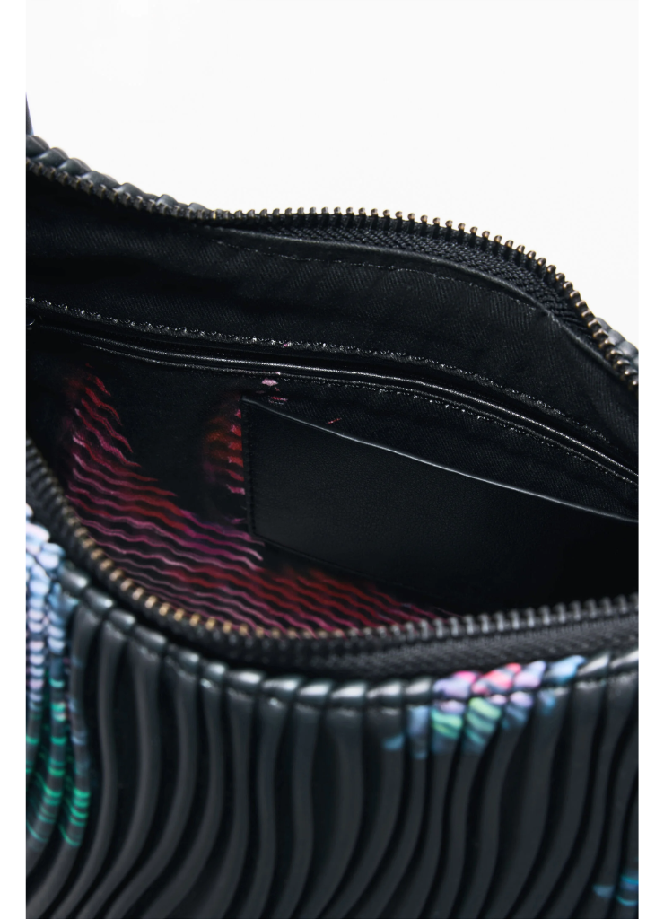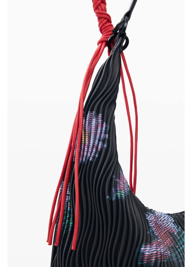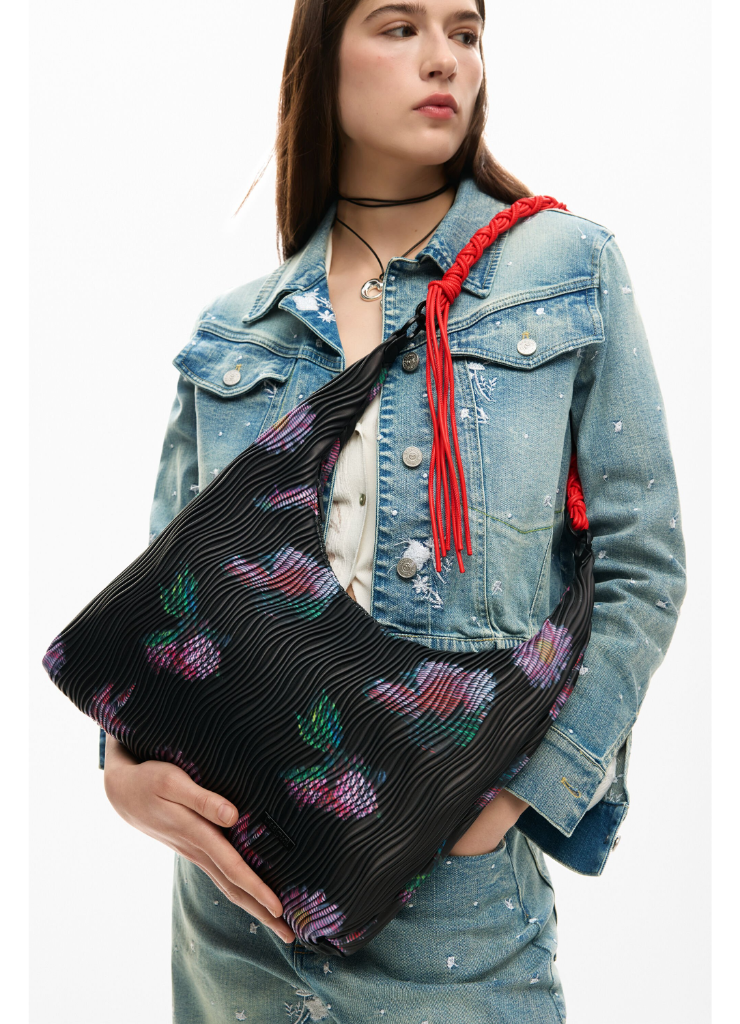 Μεσαίου μεγέθους τσάντα με οβάλ σχήμα, εναλλάξιμους ιμάντες, ανάγλυφη υφή με δερμάτινη όψη και αφηρημένο σχέδιο με λουλούδια