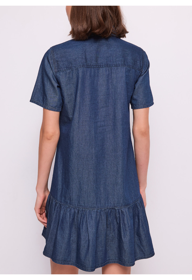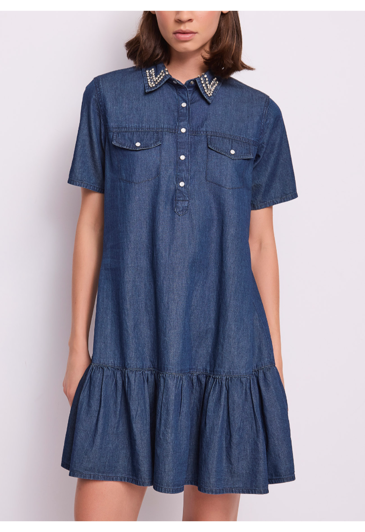 Επιλέξτε το κοντό βαμβακερό τζιν φόρεμα με γιακά πόλο, στρας, τσέπες στο στήθος και βολάν στο τελείωμα. Για μια φρέσκια, λαμπερή και ακαταμάχητα κομψή εμφάνιση.
