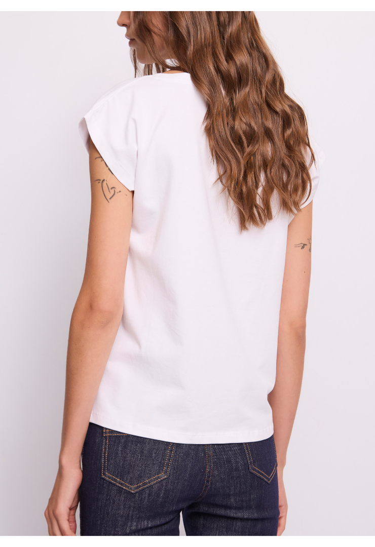 Επιλέξτε το ελαστικό βαμβακερό μπλουζάκι με πλαστικοποιημένο φλοράλ στάμπα, λογότυπο και στρας στο μπροστινό μέρος. Για ένα λαμπερό και θηλυκό casual look.