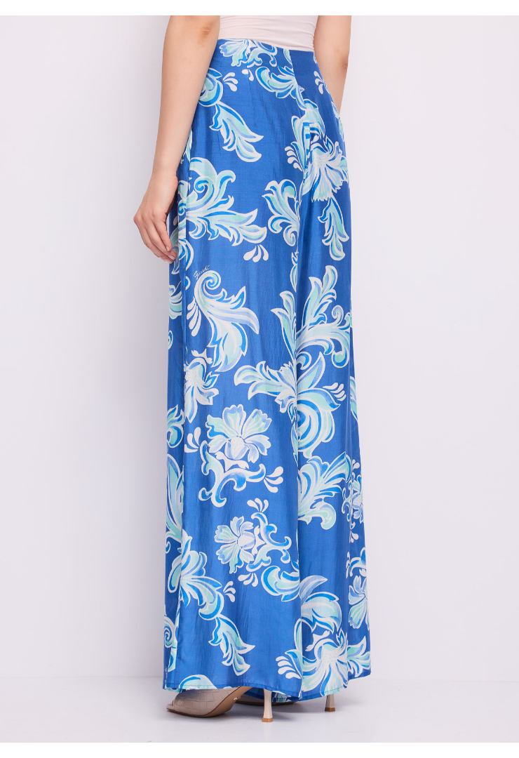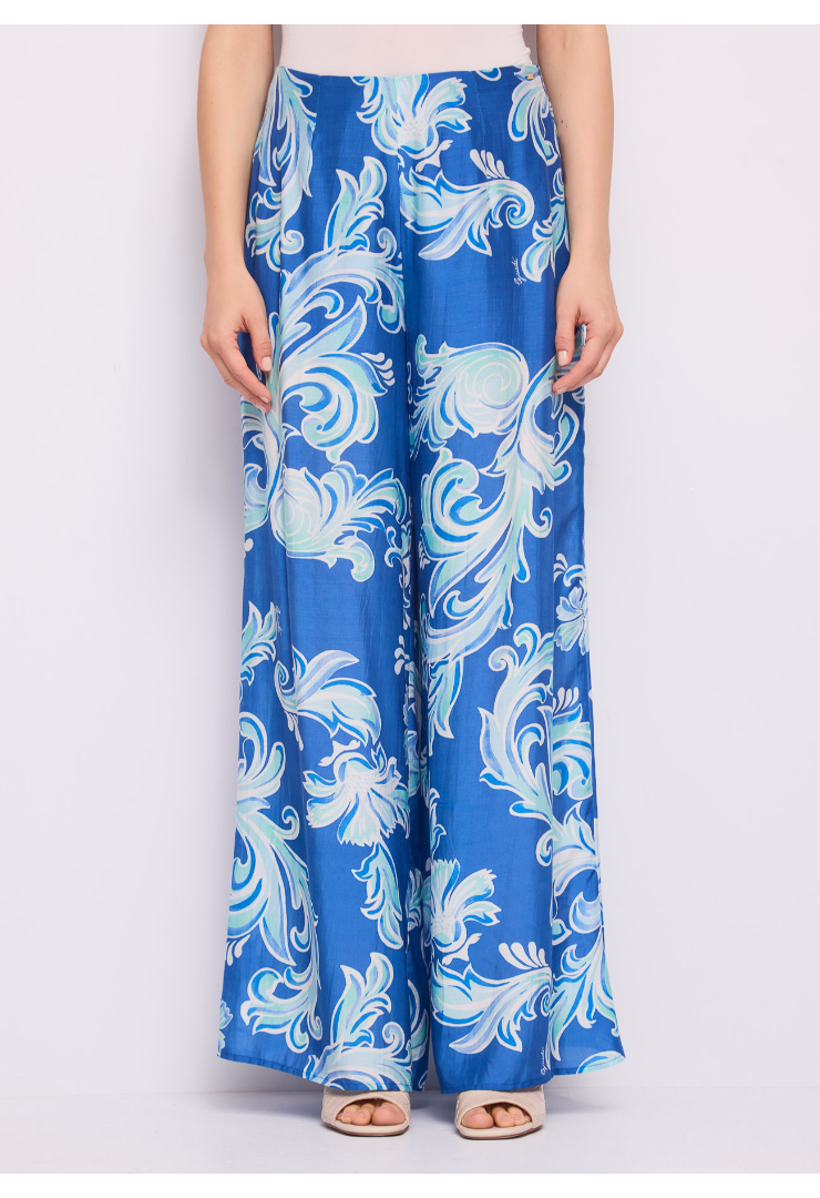 Επίλεξε ένα παντελόνι βουάλ με τύπωμα, μεταλλικό λογότυπο και αόρατο φερμουάρ στο πλάι. Ρευστή γραμμή για ανάλαφρη εμφάνιση που δονείται από την καλοκαιρινή ενέργεια.