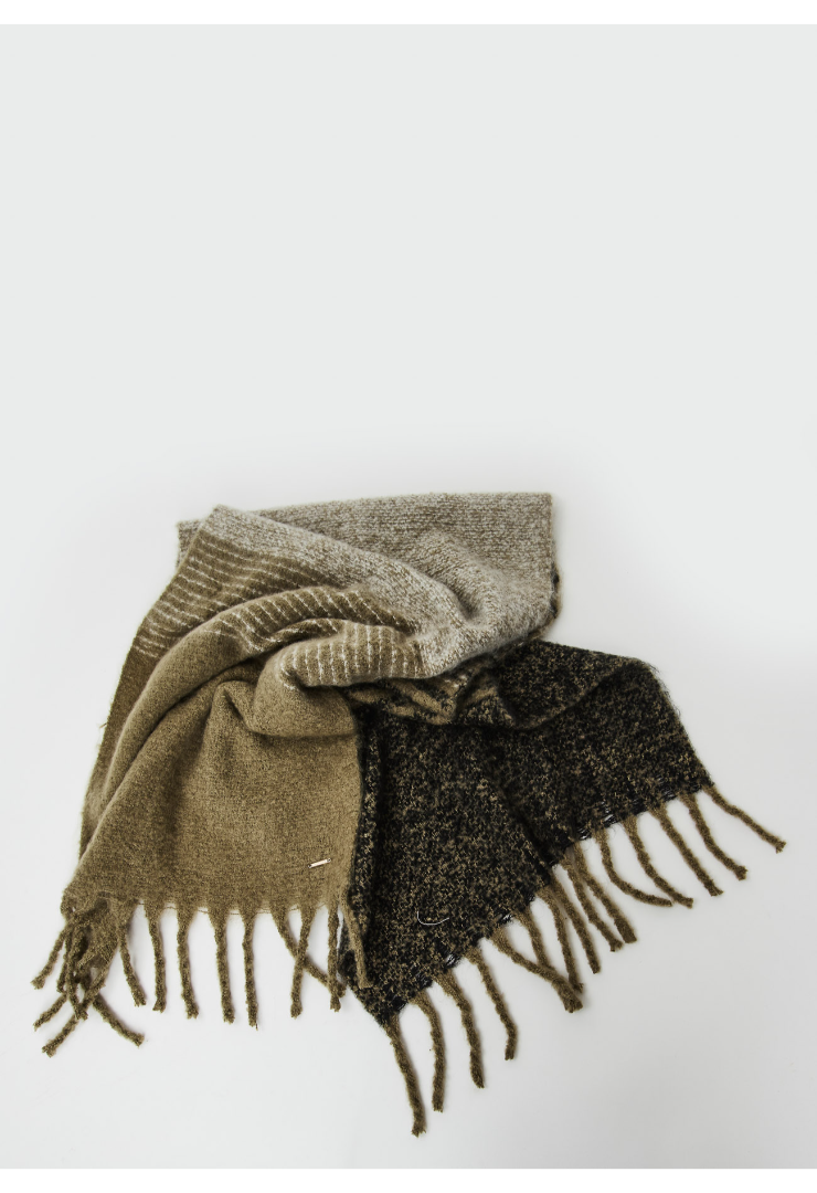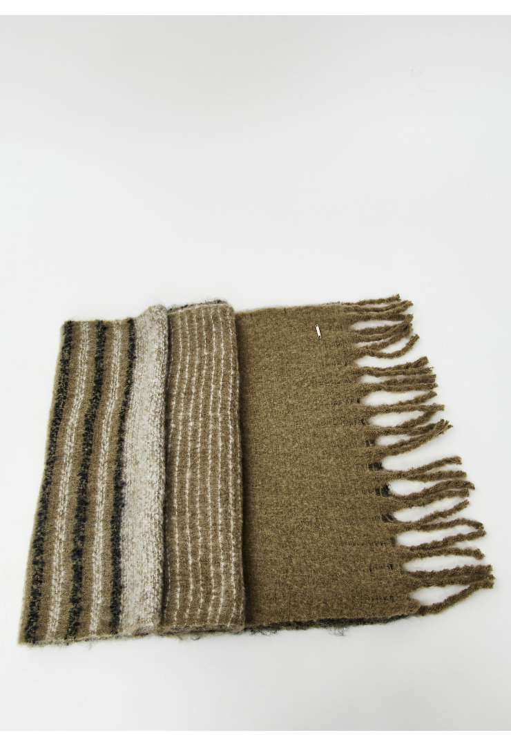 Επιλέξτε το φουλάρι από μαλακό νήμα με ριγέ μοτίβο, κρόσσια και μεταλλικό λογότυπο. Απαλό και ζεστό για ένα εκλεπτυσμένο αστικό στυλ.